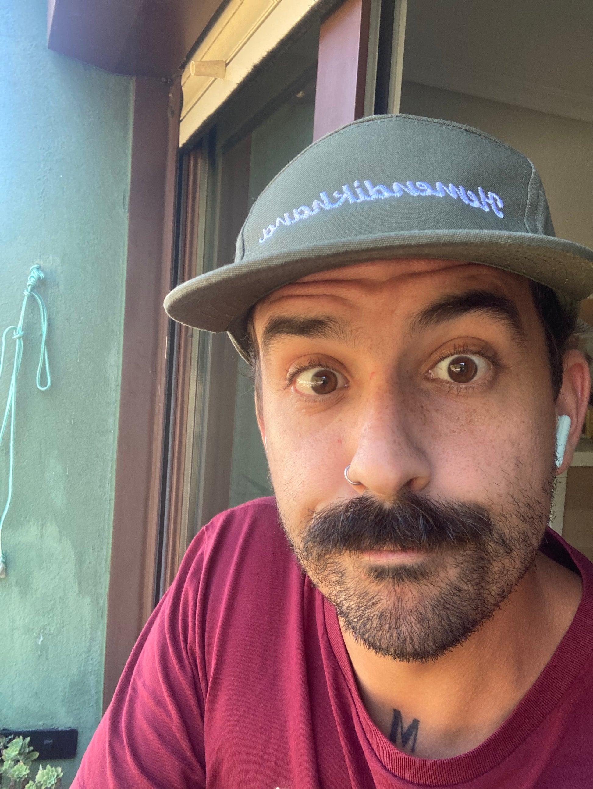 Gorra de 5 paneles color verde oliva, bordado en color blanco.